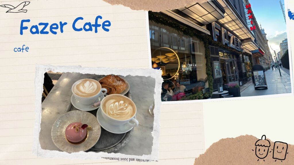 ゲイシャで有名なフィンランドお菓子メーカーのカフェで、ゲイシャラテとゲイシャケーキ、ついでにシナモンロールをいただきました。
